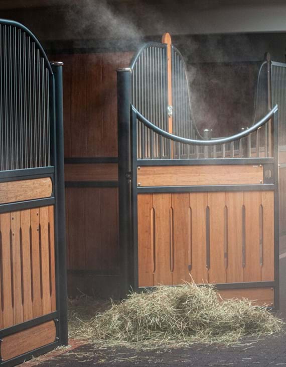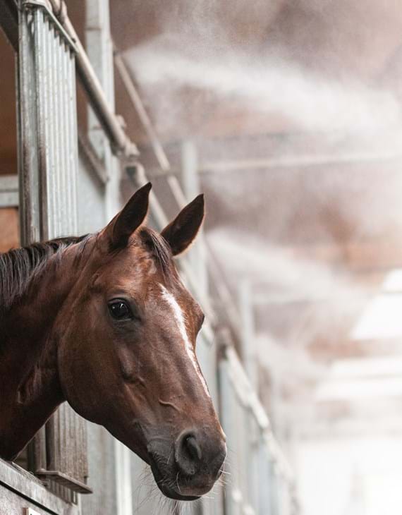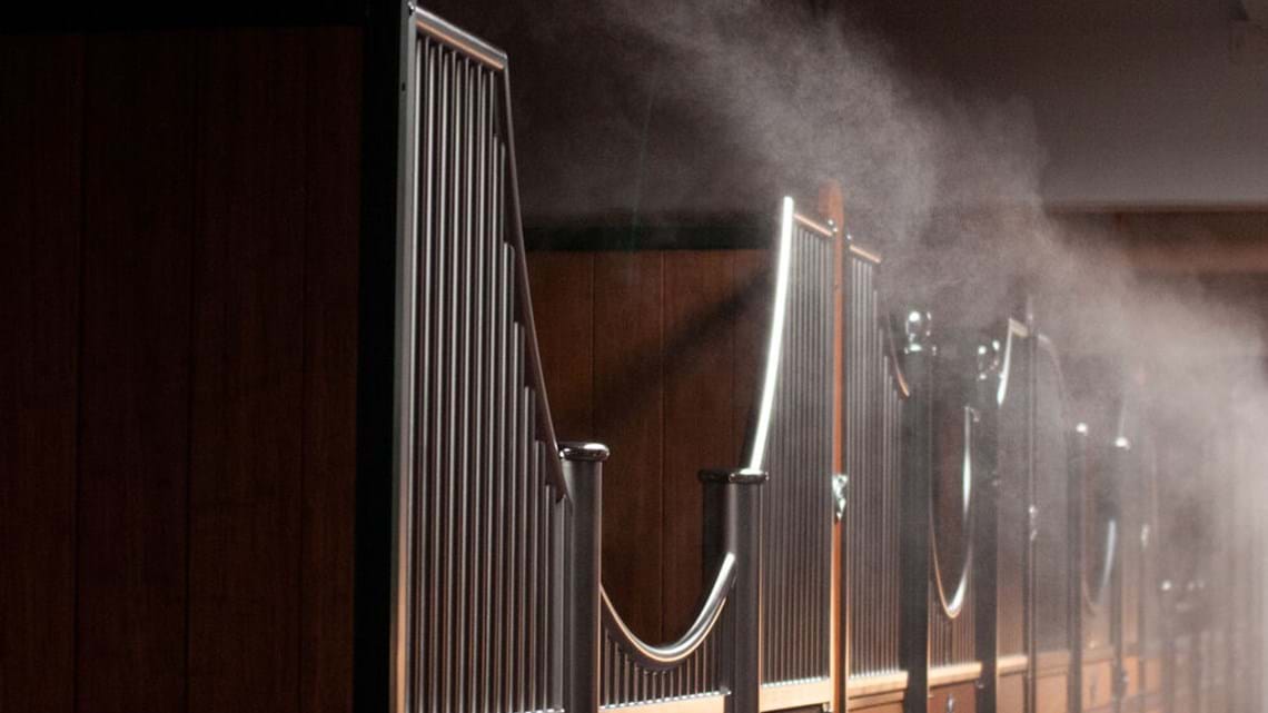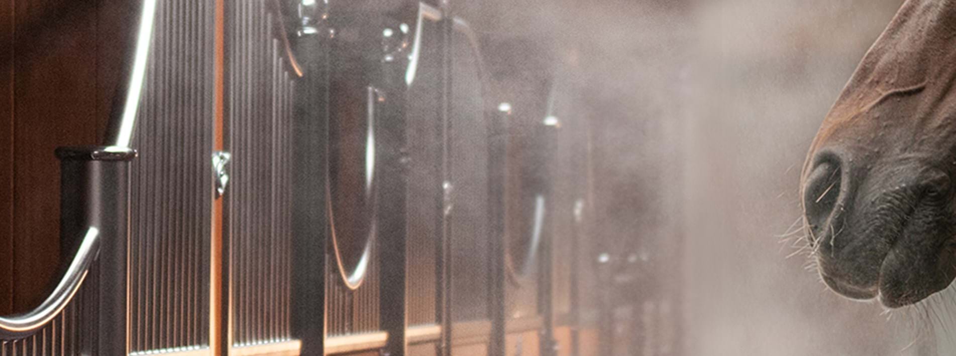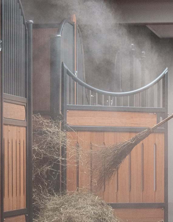 Tiny water molecules are sprayed floating in the room. This finest mist binds unwanted particles such as dust, bacteria or viruses in the air and ensures a clean room climate, a pleasant temperature and humidity. Irritations of the respiratory tract and mucous membranes are thus reduced. In addition, the system offers modern options for disinfection or the use of additional active substances to extend a health effect. At the same time, the self-contained system is hygienically absolutely safe. This makes your stable an all-round oasis of well-being.